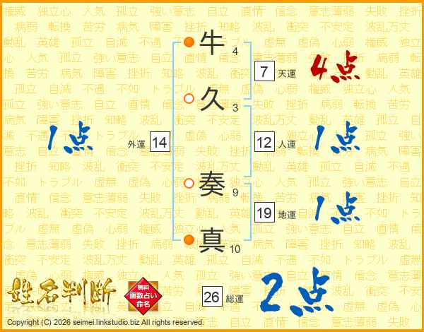 牛(4画)久(3画) 奏(9画)真(10画)