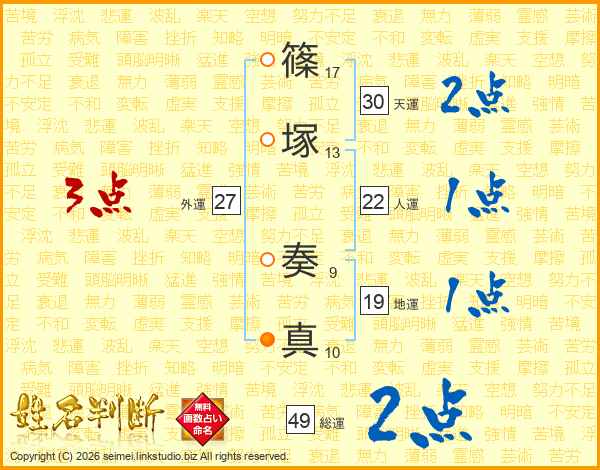 篠(17画)塚(13画) 奏(9画)真(10画)
