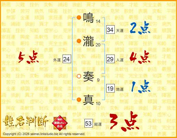 鳴(14画)瀧(20画) 奏(9画)真(10画)