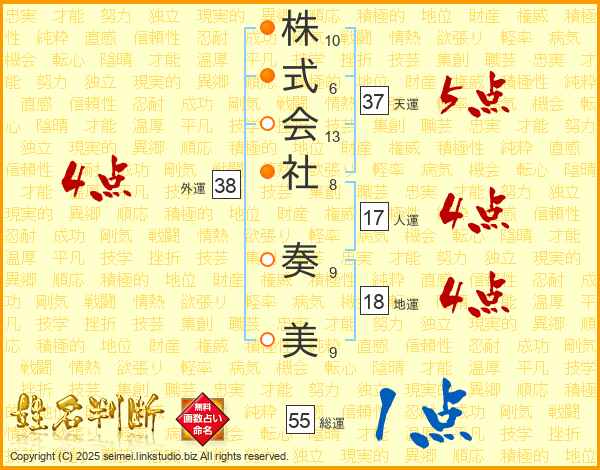 株(10画)式(6画)会(13画)社(8画) 奏(9画)美(9画)