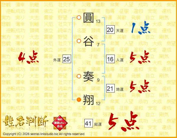 圓(13画)谷(7画) 奏(9画)翔(12画)