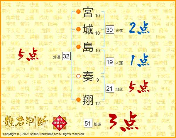 宮(10画)城(10画)島(10画) 奏(9画)翔(12画)