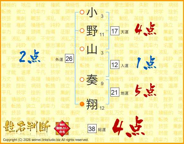 小野山奏翔さんの総運は38画の4点!