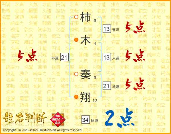 柿(9画)木(4画) 奏(9画)翔(12画)