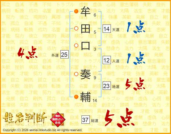 牟(6画)田(5画)口(3画) 奏(9画)輔(14画)