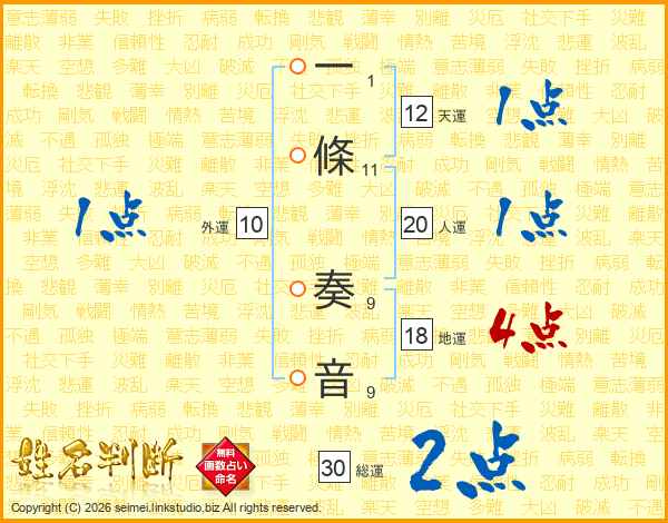 画数の奇数(○陽)と偶数(●陰)の配列で吉凶を占います。どちらかにかたよる名前は大凶名で避ける必要があります。画数の奇数偶数。