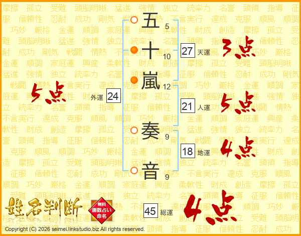 五十嵐奏音さんの総運は45画の4点!