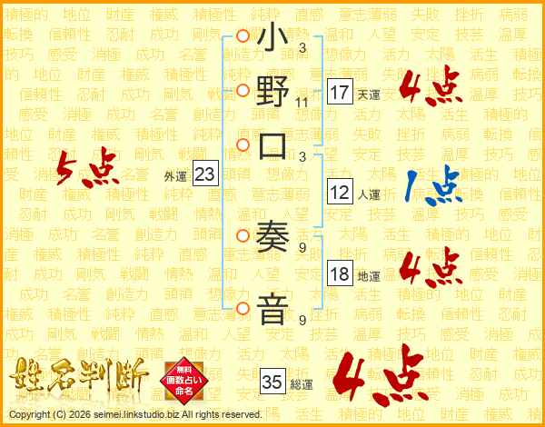 生活面を象徴する運勢です。外部から受ける影響力を表し、結婚運、家庭運や職場、環境への順応性を表します。総運から人運を引いた画数。姓や名が1文字の場合を除く。