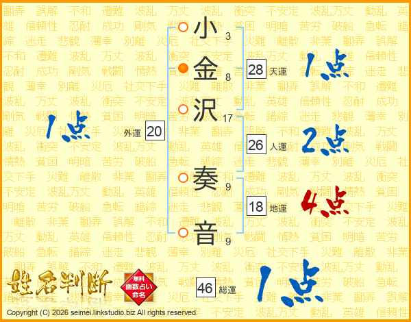 小(3画)金(8画)沢(17画) 奏(9画)音(9画)