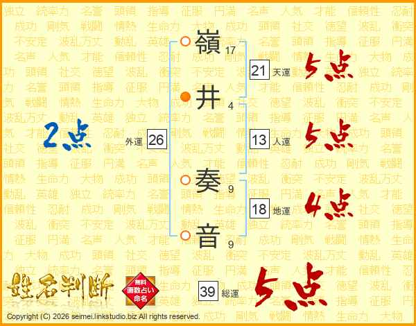 嶺(17画)井(4画) 奏(9画)音(9画)
