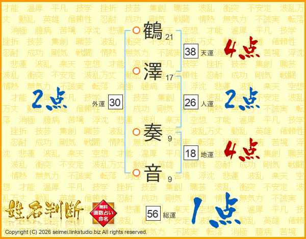 鶴(21画)澤(17画) 奏(9画)音(9画)