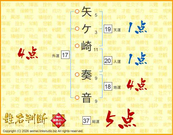 矢ケ崎奏音さんの総運は37画の5点!