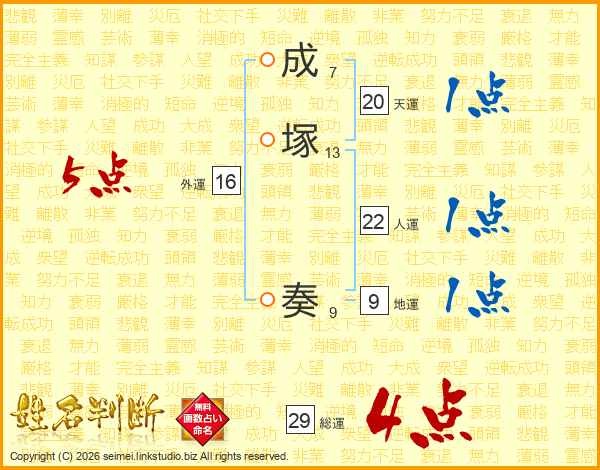 生活面を象徴する運勢です。外部から受ける影響力を表し、結婚運、家庭運や職場、環境への順応性を表します。総運から人運を引いた画数。姓や名が1文字の場合を除く。