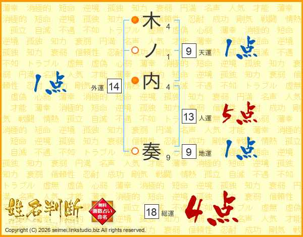 木ノ内奏さんの総運は18画の4点!