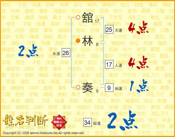舘(17画)林(8画) 奏(9画)