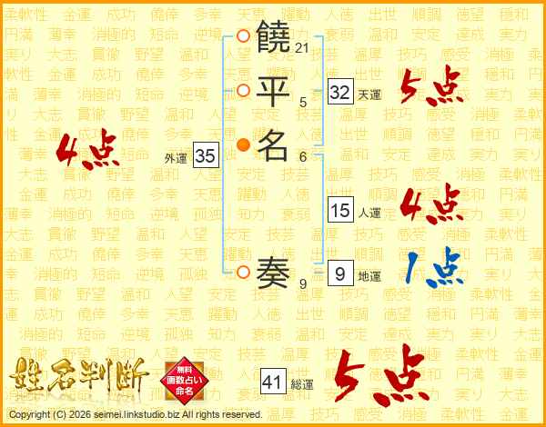 饒平名奏さんの総運は41画の5点!