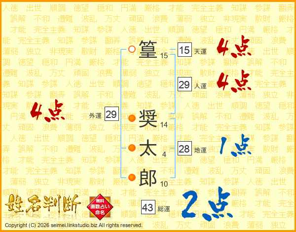 篁奨太郎さんの総運は43画の2点!