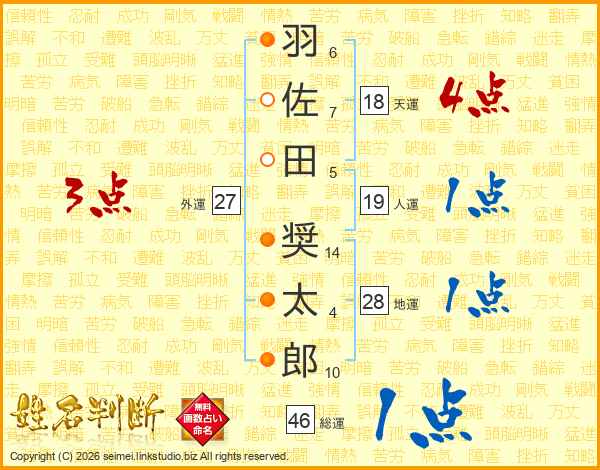 羽(6画)佐(7画)田(5画) 奨(14画)太(4画)郎(10画)