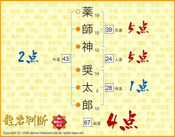 薬師神奨太郎さんの総運は67画の4点!