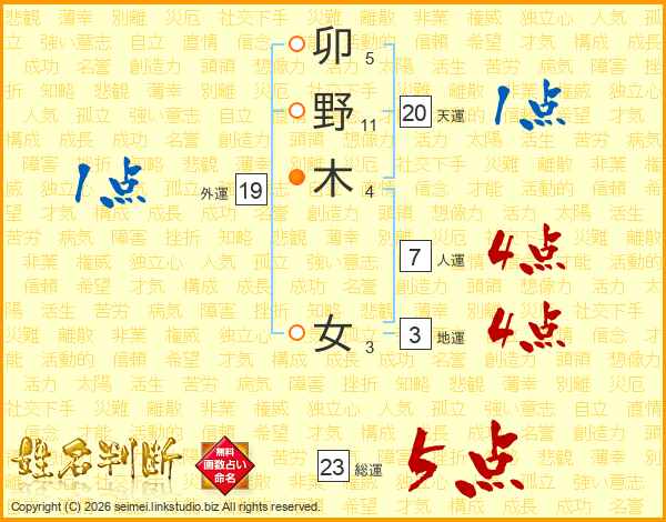 生活面を象徴する運勢です。外部から受ける影響力を表し、結婚運、家庭運や職場、環境への順応性を表します。総運から人運を引いた画数。姓や名が1文字の場合を除く。