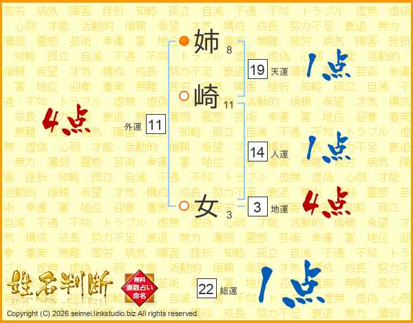 姉(8画)崎(11画) 女(3画)