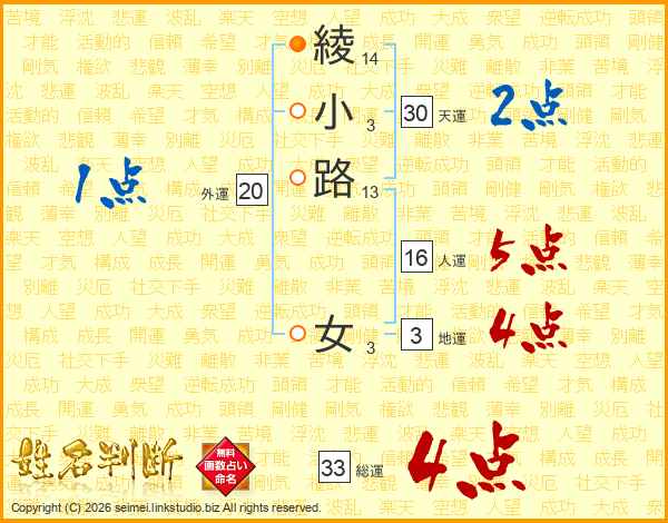 綾小路女さんの総運は33画の4点!