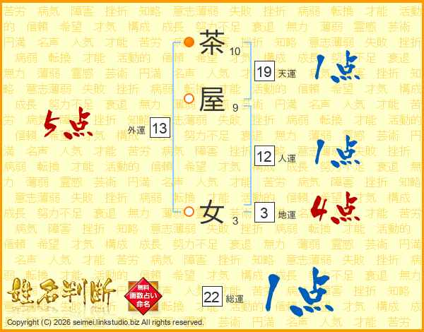 生活面を象徴する運勢です。外部から受ける影響力を表し、結婚運、家庭運や職場、環境への順応性を表します。総運から人運を引いた画数。姓や名が1文字の場合を除く。