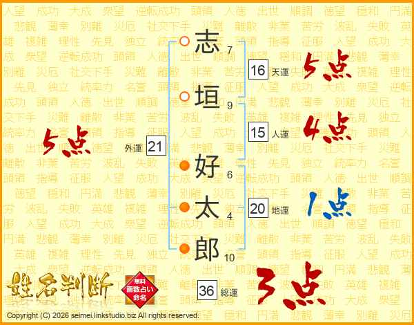志(7画)垣(9画) 好(6画)太(4画)郎(10画)