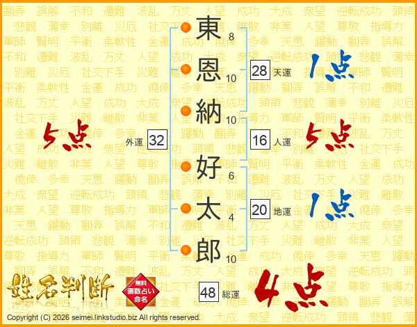 東(8画)恩(10画)納(10画) 好(6画)太(4画)郎(10画)