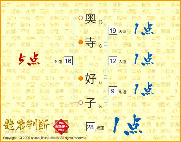 生活面を象徴する運勢です。外部から受ける影響力を表し、結婚運、家庭運や職場、環境への順応性を表します。総運から人運を引いた画数。姓や名が1文字の場合を除く。