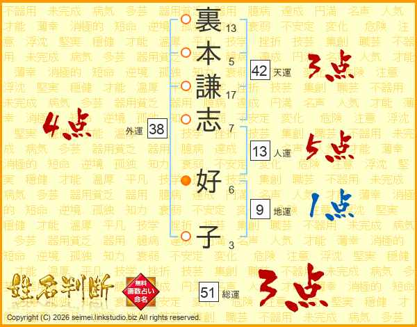 裏本謙志好子さんの人運は13画の5点!