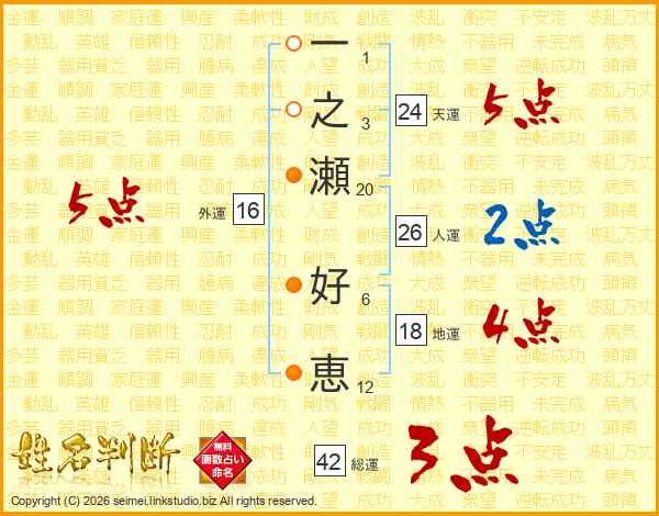 一(1画)之(3画)瀬(20画) 好(6画)恵(12画)