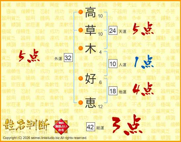 高(10画)草(10画)木(4画) 好(6画)恵(12画)