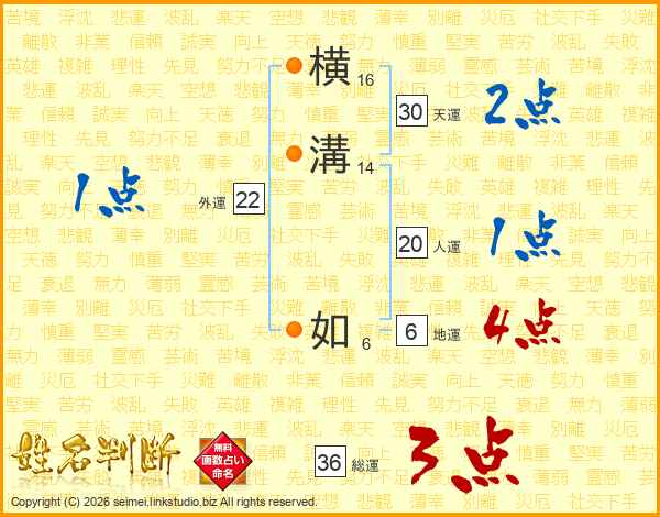 生活面を象徴する運勢です。外部から受ける影響力を表し、結婚運、家庭運や職場、環境への順応性を表します。総運から人運を引いた画数。姓や名が1文字の場合を除く。