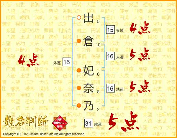 出(5画)倉(10画) 妃(6画)奈(8画)乃(2画)