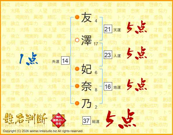 友(4画)澤(17画) 妃(6画)奈(8画)乃(2画)
