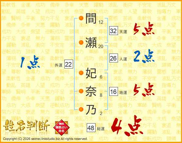 間(12画)瀬(20画) 妃(6画)奈(8画)乃(2画)