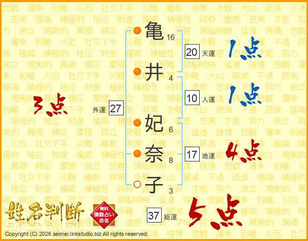 亀井妃奈子さんの総運は37画の5点!