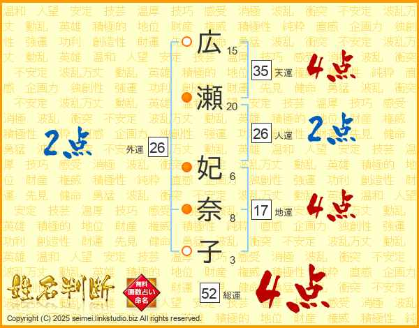 広(15画)瀬(20画) 妃(6画)奈(8画)子(3画)