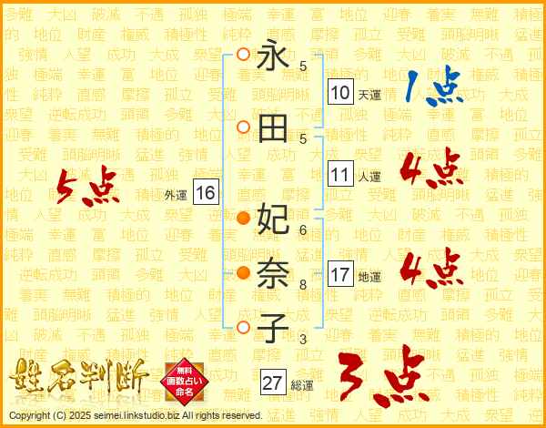 永(5画)田(5画) 妃(6画)奈(8画)子(3画)