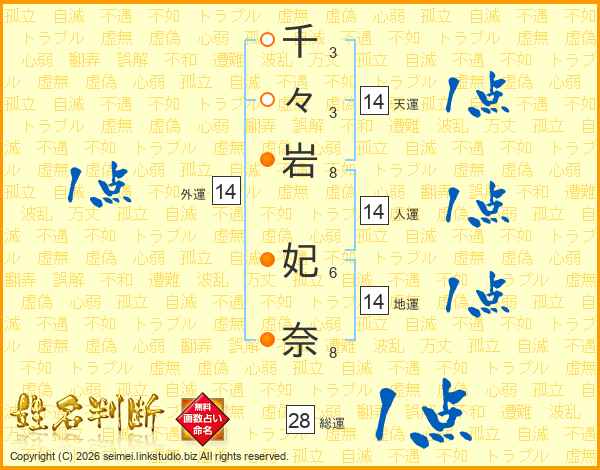 千(3画)々(3画)岩(8画) 妃(6画)奈(8画)