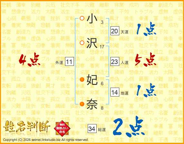 小(3画)沢(17画) 妃(6画)奈(8画)