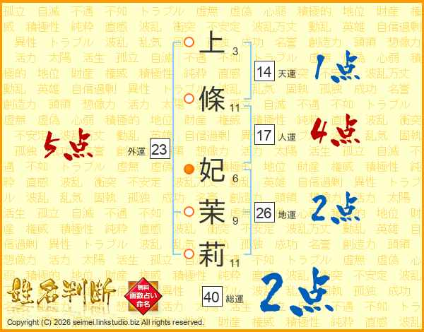 上(3画)條(11画) 妃(6画)茉(9画)莉(11画)