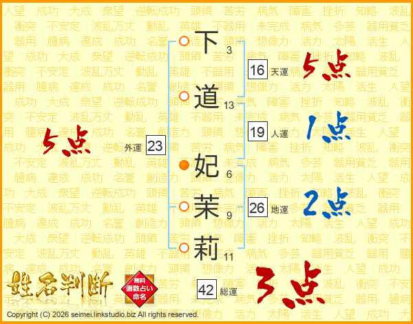 下(3画)道(13画) 妃(6画)茉(9画)莉(11画)