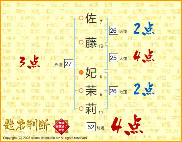 佐藤妃茉莉さんの天運は26画の2点!