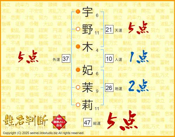 宇(6画)野(11画)木(4画) 妃(6画)茉(9画)莉(11画)