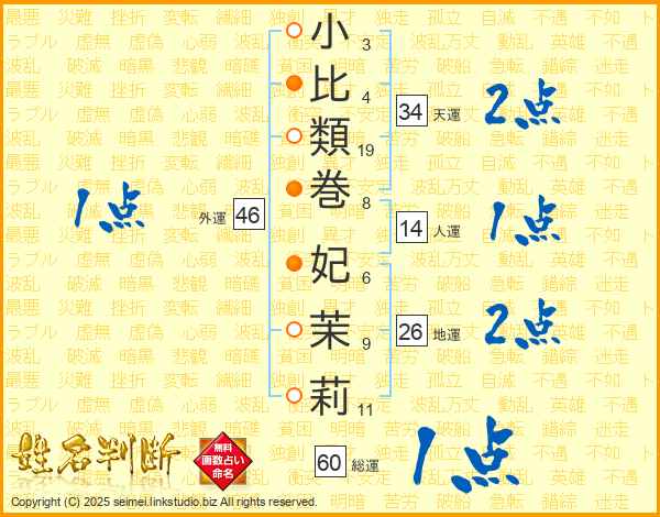 小(3画)比(4画)類(19画)巻(8画) 妃(6画)茉(9画)莉(11画)