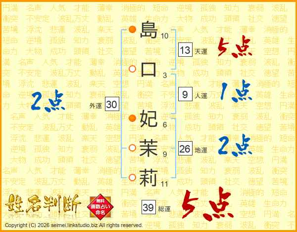 島(10画)口(3画) 妃(6画)茉(9画)莉(11画)