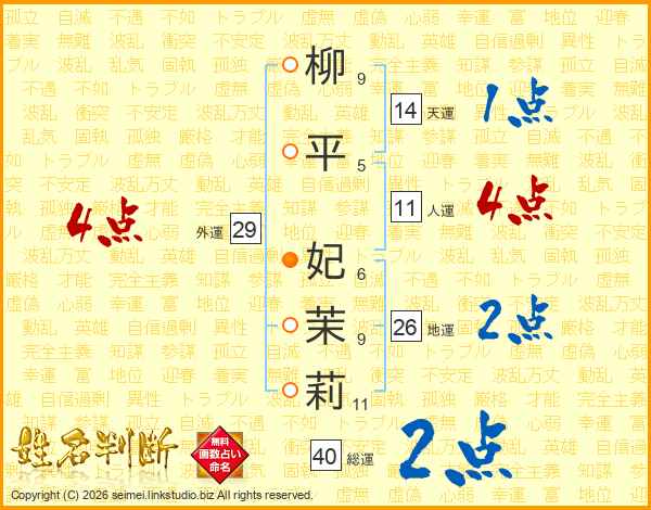 柳(9画)平(5画) 妃(6画)茉(9画)莉(11画)