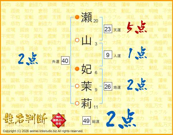 瀬(20画)山(3画) 妃(6画)茉(9画)莉(11画)